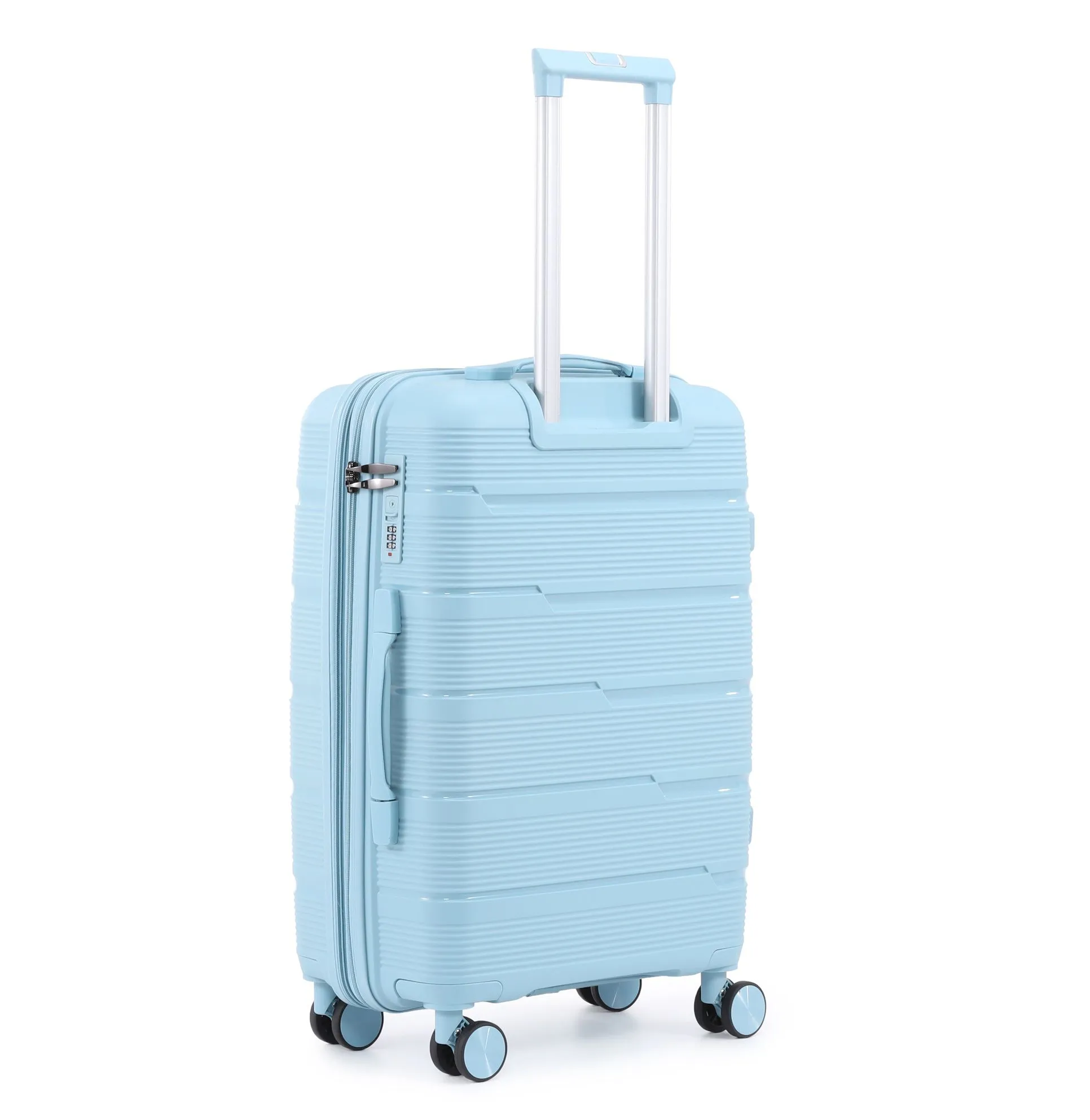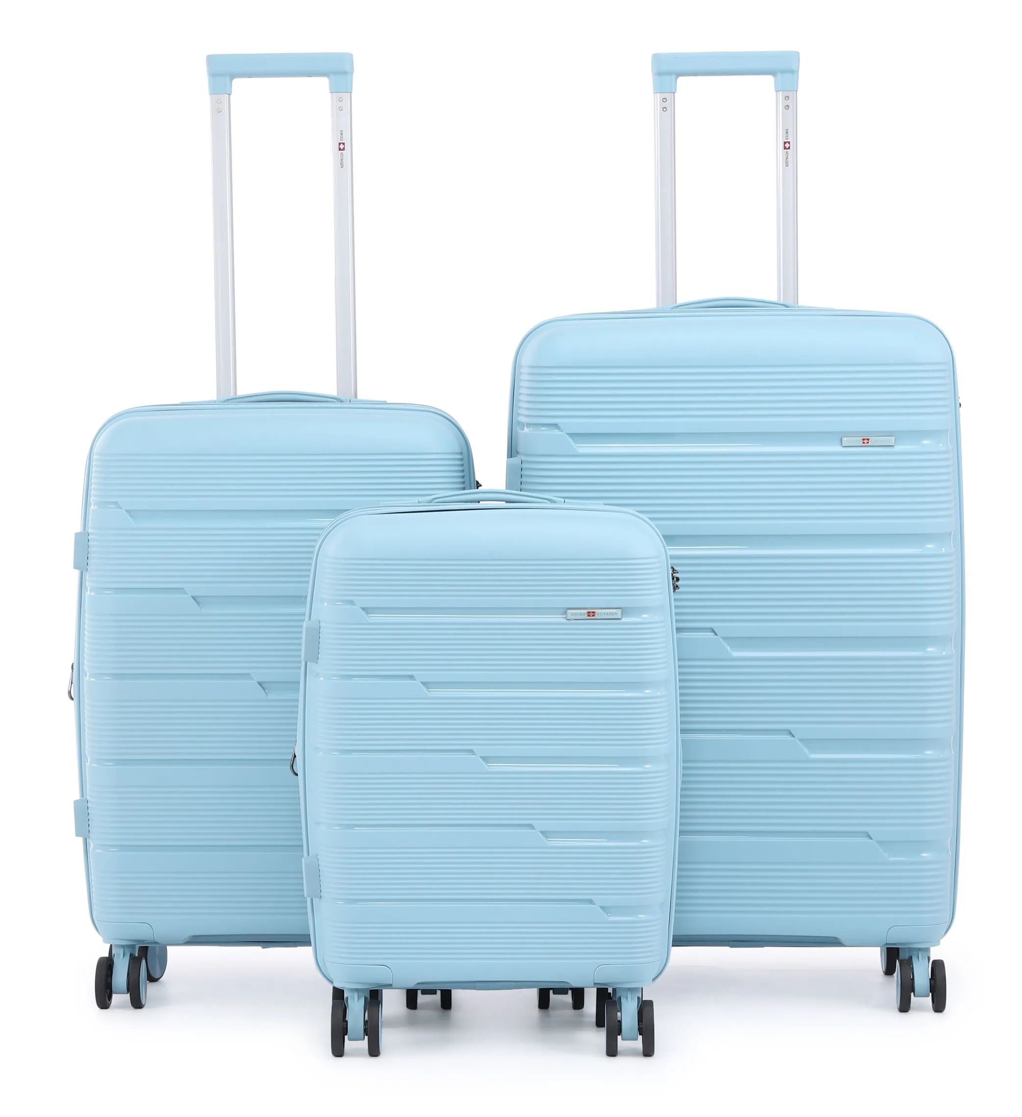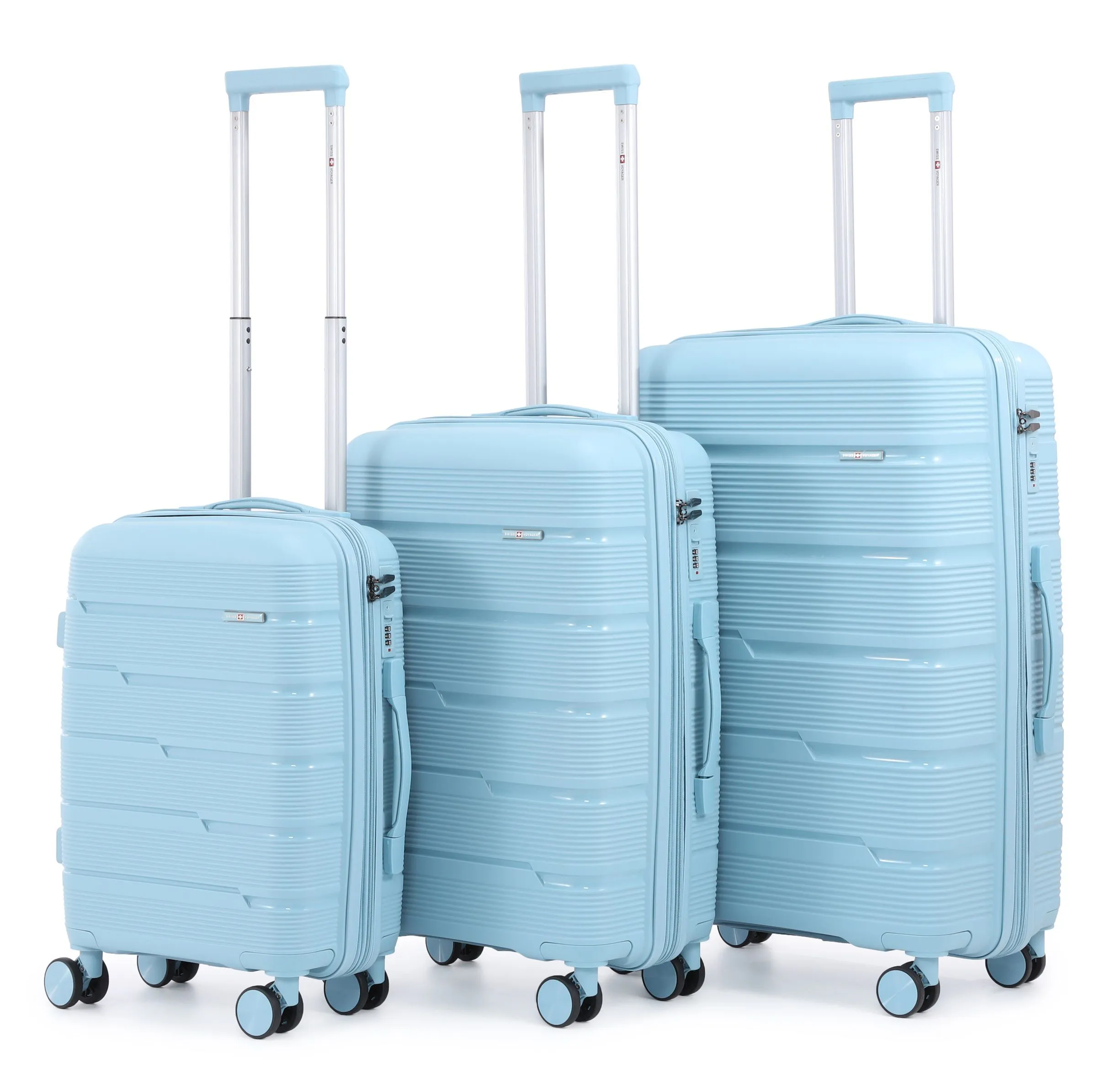 סט מזוודות קשיחות במיוחד עם הגנה מקסימלית, עשויות מפוליפרופילן בלתי שביר, בגדלים 20/24/28 אינץ’. עיצוב יוקרתי ועמידות גבוהה במיוחד לשימוש יומיומי ולטיסות ארוכות.
