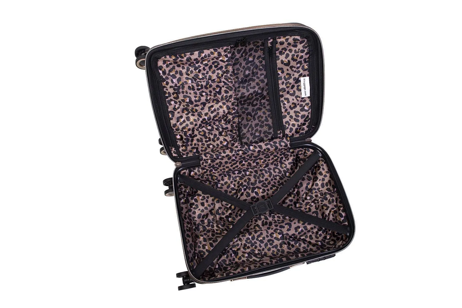 הסט כולל 5 פריטים: מזוודה גדולה מאוד (32"), מזוודה גדולה (28"), מזוודה בינונית (24"), טרולי עלייה למטוס (20"), ותיק תואם (14") עם רצועות גומי המתחברות בקלות לידית הטרולי – לנשיאה נוחה ומעוצבת